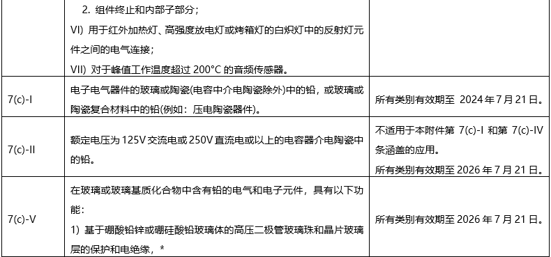 評(píng)估結(jié)果顯示,部分豁免條款將不再延期,部分條款的豁免范圍將變得更加精細(xì)。后續(xù)歐盟將根據(jù)該評(píng)估結(jié)果發(fā)布RoHS修訂草案,修訂草案獲得通過后歐盟將發(fā)布正式歐盟RoHS修訂指令進(jìn)而修改以上豁免條款。修改后最終評(píng)估報(bào)告所列豁免條款及有效期如下: