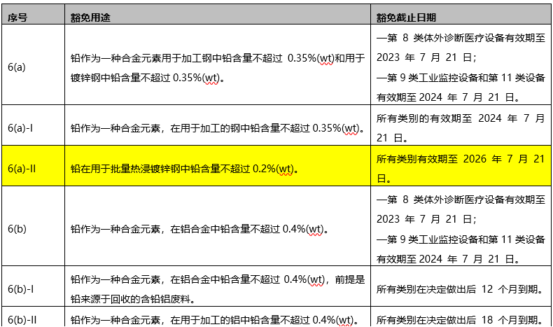 2022年2月17日,歐盟評(píng)估機(jī)構(gòu)發(fā)布修改版RoHS Pack22最終評(píng)估報(bào)告,此次僅對(duì)豁免條款6(a)-II做部分修改, 刪除“鉛作為一種合金元素”的限制。原因是對(duì)于批量鍍鋅鋼中的鉛既可能是有意添加,也可能是非有意添加,而目前要區(qū)分在批量鍍鋅鋼中有意添加的鉛是不切實(shí)際的,所以此次修改去掉“鉛作為一種合金元素”的限制,放寬豁免范圍,修改前后的對(duì)比如下: