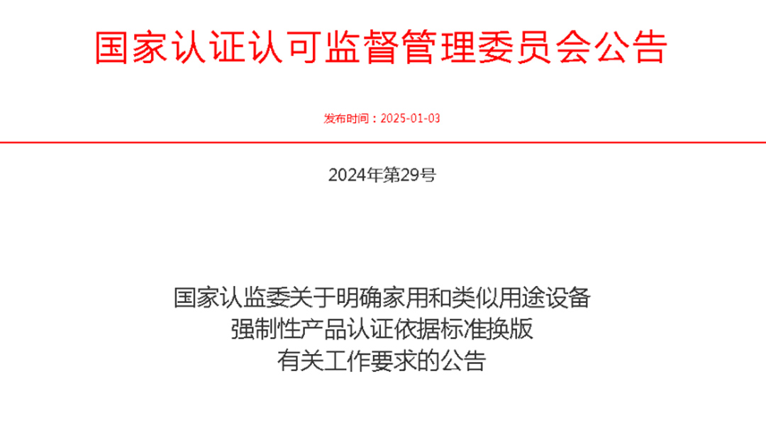 關于家用和類似用途設備強制性產品認證執行新版標準等有關要求的通知,